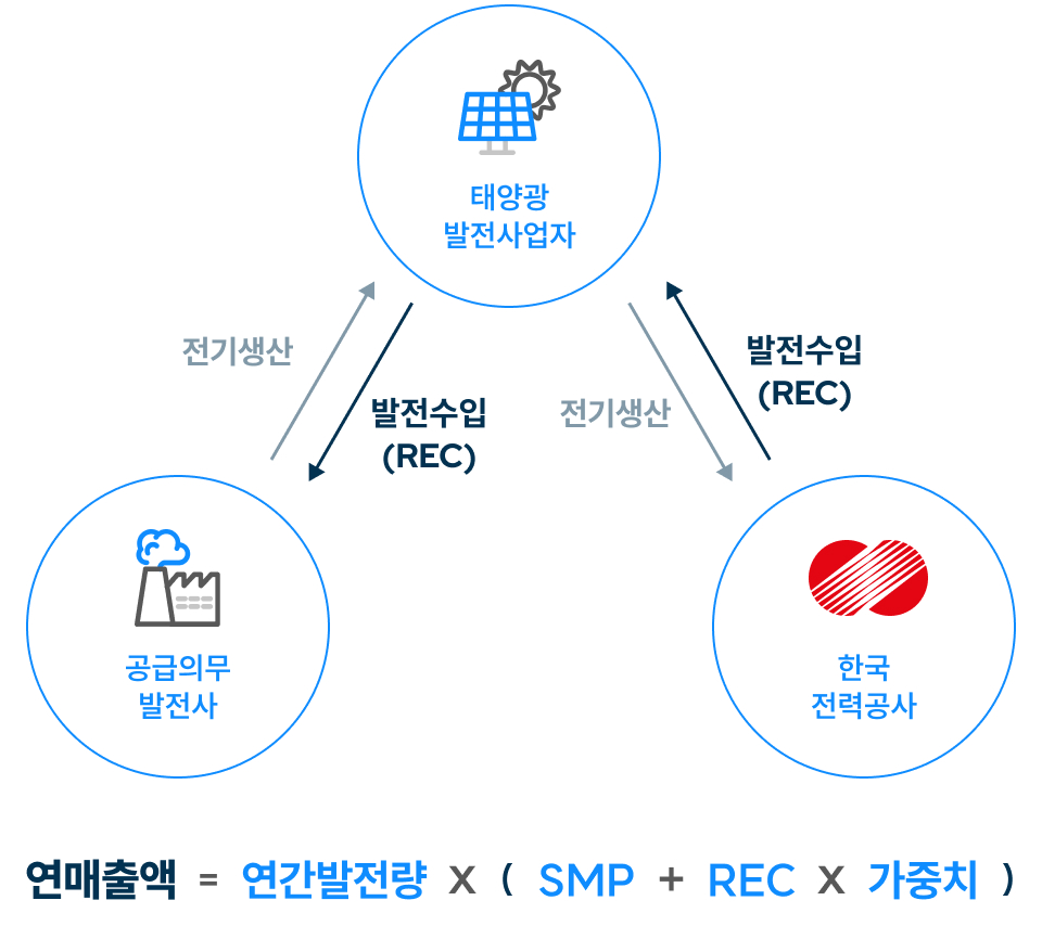 - 전력시장에서 결정되는 전력의 가격(SMP), 신재생 에너지를 이용하여 에너지를 공급한 사실을 증명하는 인증서(REC), REC가중치 부여로 수익 발생